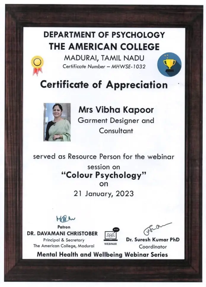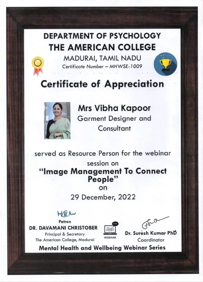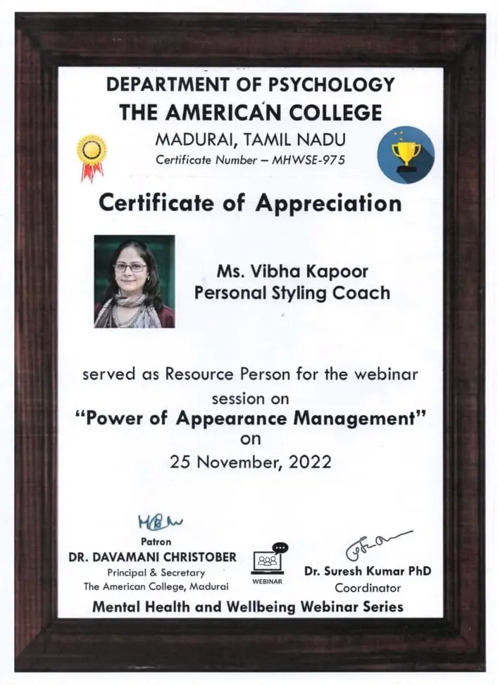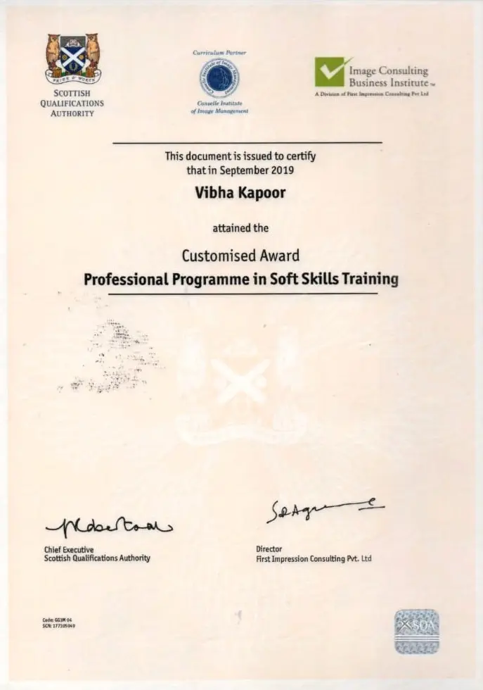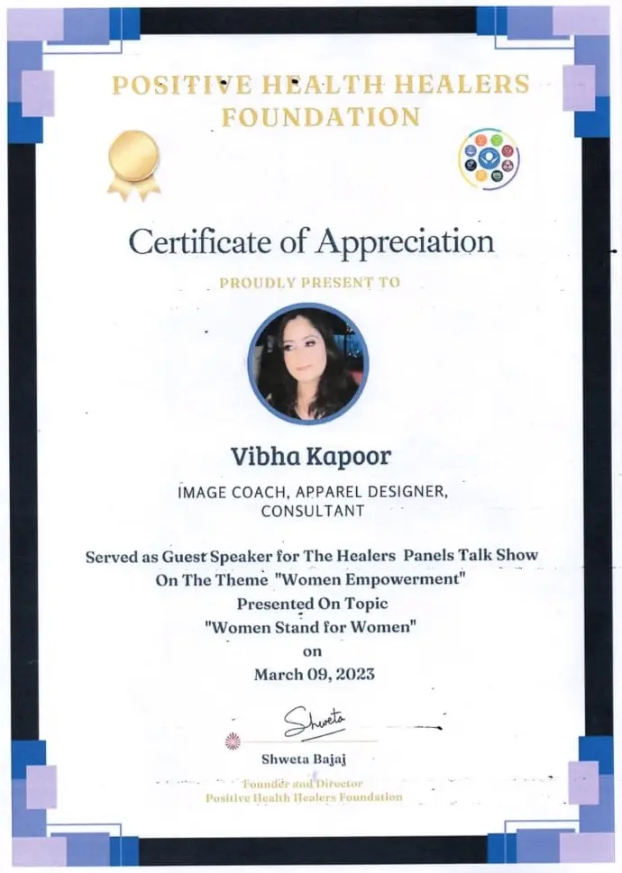 Vibha Kapoor, an incredibly dedicated and experienced Personal Styling Coach! Her unique approach to enhancing individual personalities through Appearance Management and bespoke design elements is truly commendable.Her vibrant spirit and self-belief, rooted in a nurturing upbringing, make you a dynamic and innovative coach in the realms of design, image, style, and etiquette.